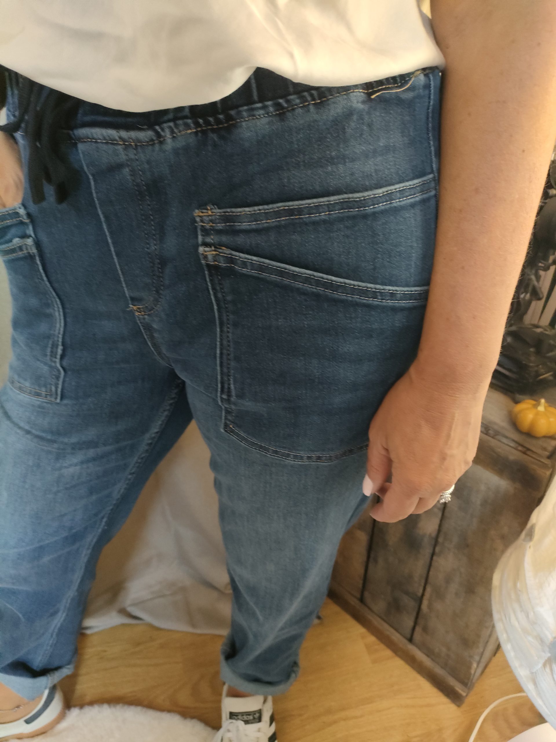 Jeans coupe décontractée pour un confort optimal et un style décontracté. Sa taille élastiquée avec cordon de serrage assure un ajustement parfait. De grandes poches plaquées ajoutent une touche pratique et tendance. Idéal pour un look casual chic au quotidien.